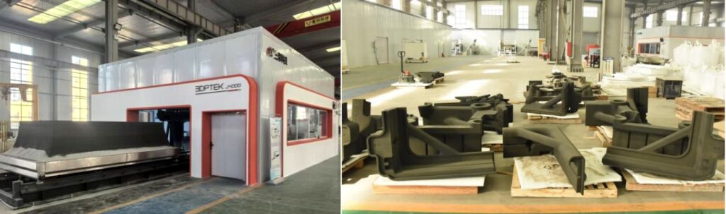 3DPTEK-J4000尤其適用于航空航天、船舶、電力能源、工程機械、汽車(新能源)等領(lǐng)域的大尺寸、批量化鑄件制造需求。在航空航天領(lǐng)域,可用于制造發(fā)動機零部件、航天器結(jié)構(gòu)件、動力裝置等重要部件,有效解決超大尺寸、多維曲面、復(fù)雜結(jié)構(gòu)工件的成型難題,在小批量大尺寸模具制造以及特種行業(yè)的模具迭代升級研發(fā)上有著傳統(tǒng)制造工藝無法比擬的優(yōu)勢。在電力能源領(lǐng)域,可用于大尺寸耐壓復(fù)雜型腔結(jié)構(gòu)件、大尺寸薄壁輕量化零部件等的制造。在汽車領(lǐng)域,可實現(xiàn)具有復(fù)雜螺旋形冷卻水道的大尺寸薄壁電機殼、輕量化車架、復(fù)雜內(nèi)腔結(jié)構(gòu)殼體缸體/缸蓋等產(chǎn)品的制造。