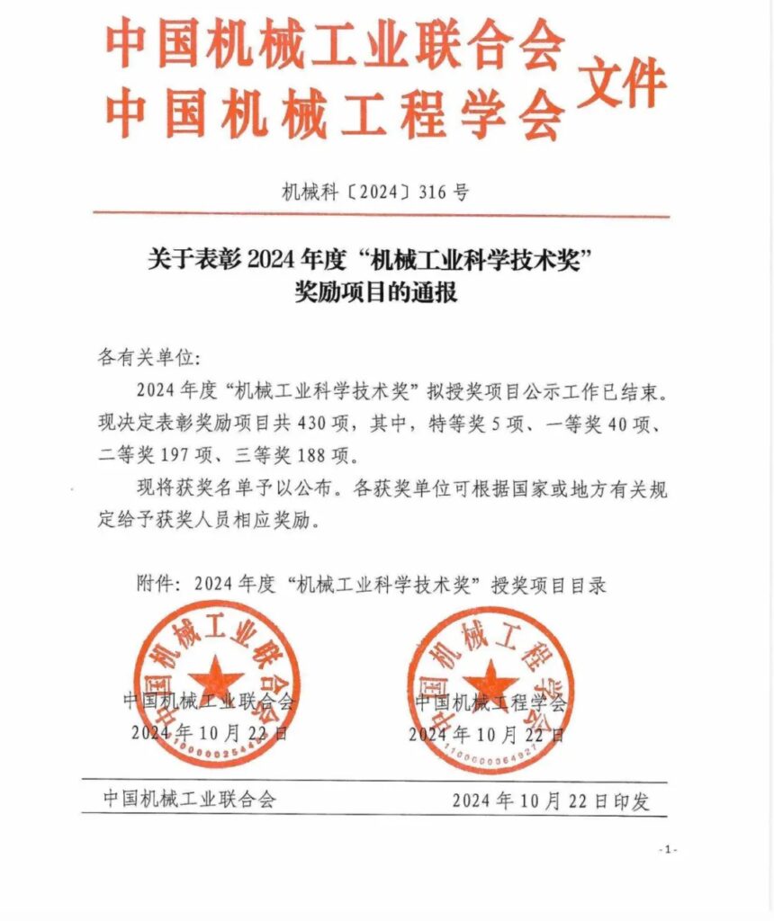 機(jī)械工業(yè)科學(xué)技術(shù)獎(jiǎng)是由中國(guó)機(jī)械工業(yè)聯(lián)合會(huì)和中國(guó)機(jī)械工程學(xué)會(huì)共同設(shè)立,經(jīng)國(guó)家科學(xué)技術(shù)部批準(zhǔn)的全國(guó)機(jī)械行業(yè)綜合性科技獎(jiǎng)項(xiàng)。2024年度“機(jī)械工業(yè)科學(xué)技術(shù)獎(jiǎng)”授獎(jiǎng)項(xiàng)目共430項(xiàng),其中,特等獎(jiǎng)5項(xiàng)、一等獎(jiǎng)40項(xiàng)、二等獎(jiǎng)197項(xiàng)、三等獎(jiǎng)188項(xiàng)。三帝科技獲此殊榮,是對(duì)公司科技創(chuàng)新能力的充分肯定與認(rèn)可。