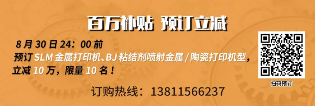 展會期間,三帝科技還將隆重推出“百萬補貼 預(yù)訂立減”活動,8月30日24:00前預(yù)訂BJ粘結(jié)劑噴射金屬/陶瓷打印機、SLM 金屬打印機的任一款機型,將立減 10 萬,限量 10 名,歡迎咨詢訂購!